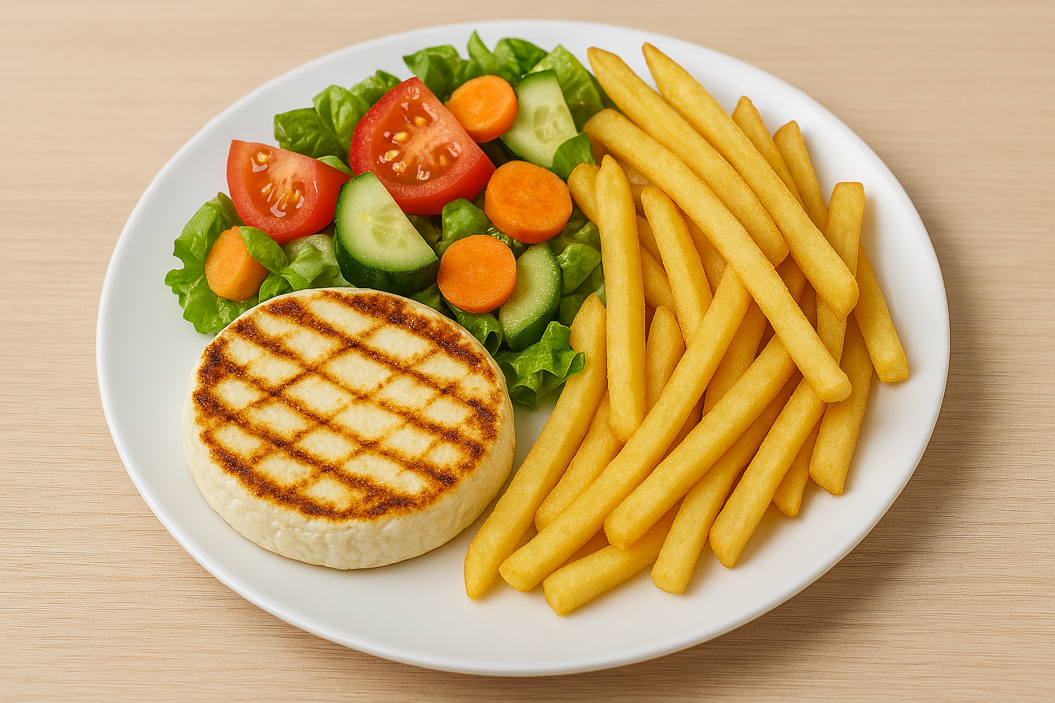 bravčové mäso, belgické hranolky, dresing, zelenina